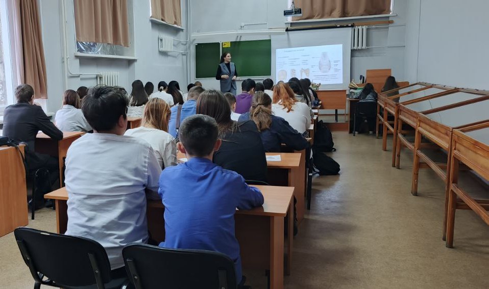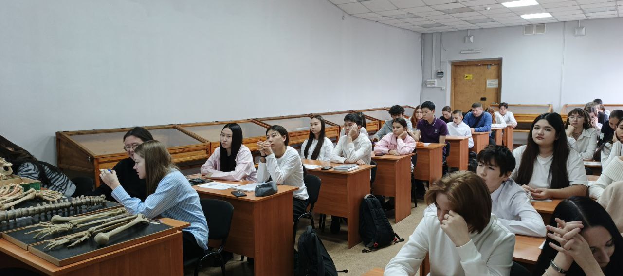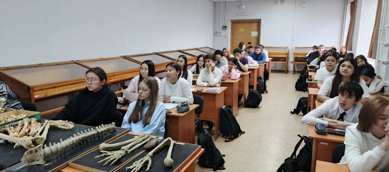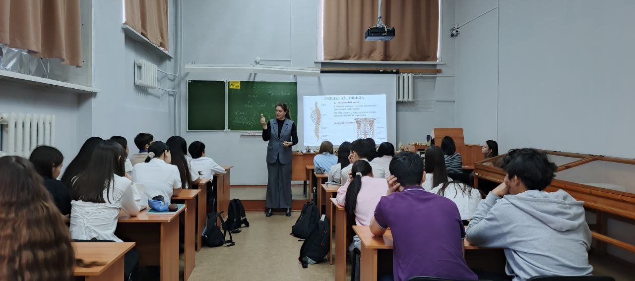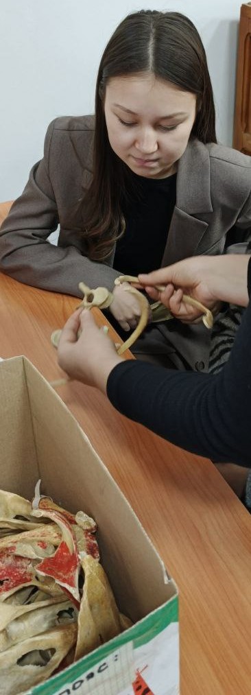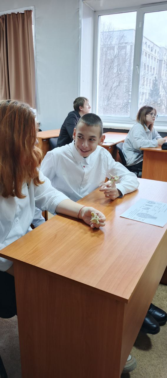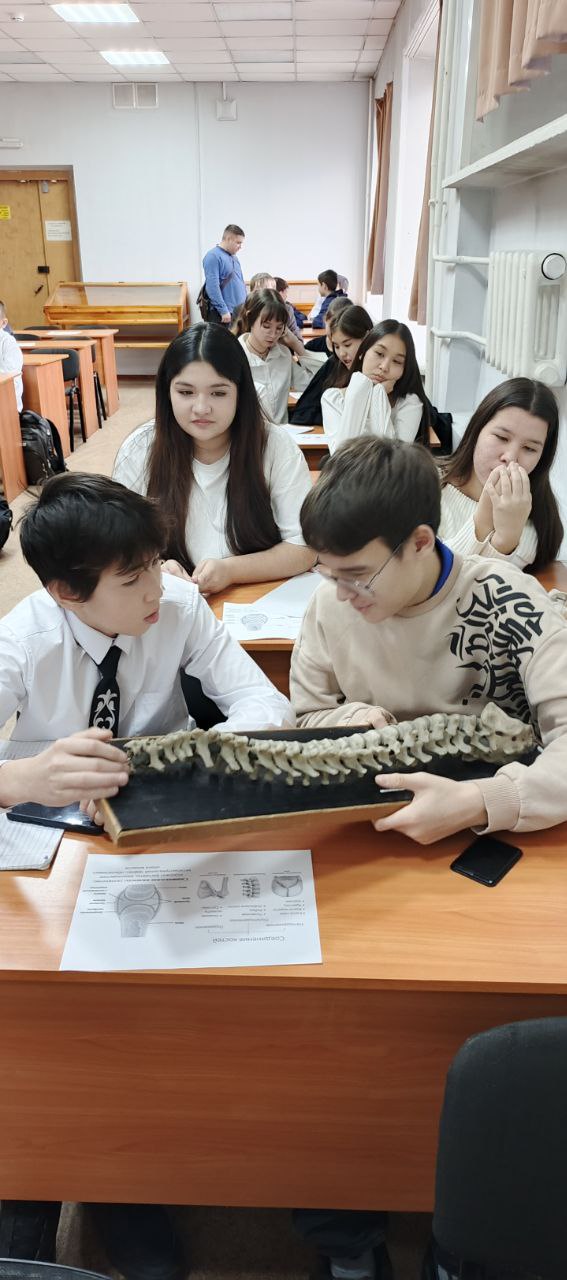 Встреча началась с небольшого теоретического материала и демонстрации декальцинированной кости. Затем школьники познакомились со строением позвоночного столба, отдельных позвонков, а также костей, образующих скелет верхних и нижних конечностей. Наглядно было показано, как кости соединяются, образуя суставы, и как эти соединения обеспечивают подвижность и гибкость. Завершилось мероприятие экскурсией в кабинет анатомии и физиологии человека.