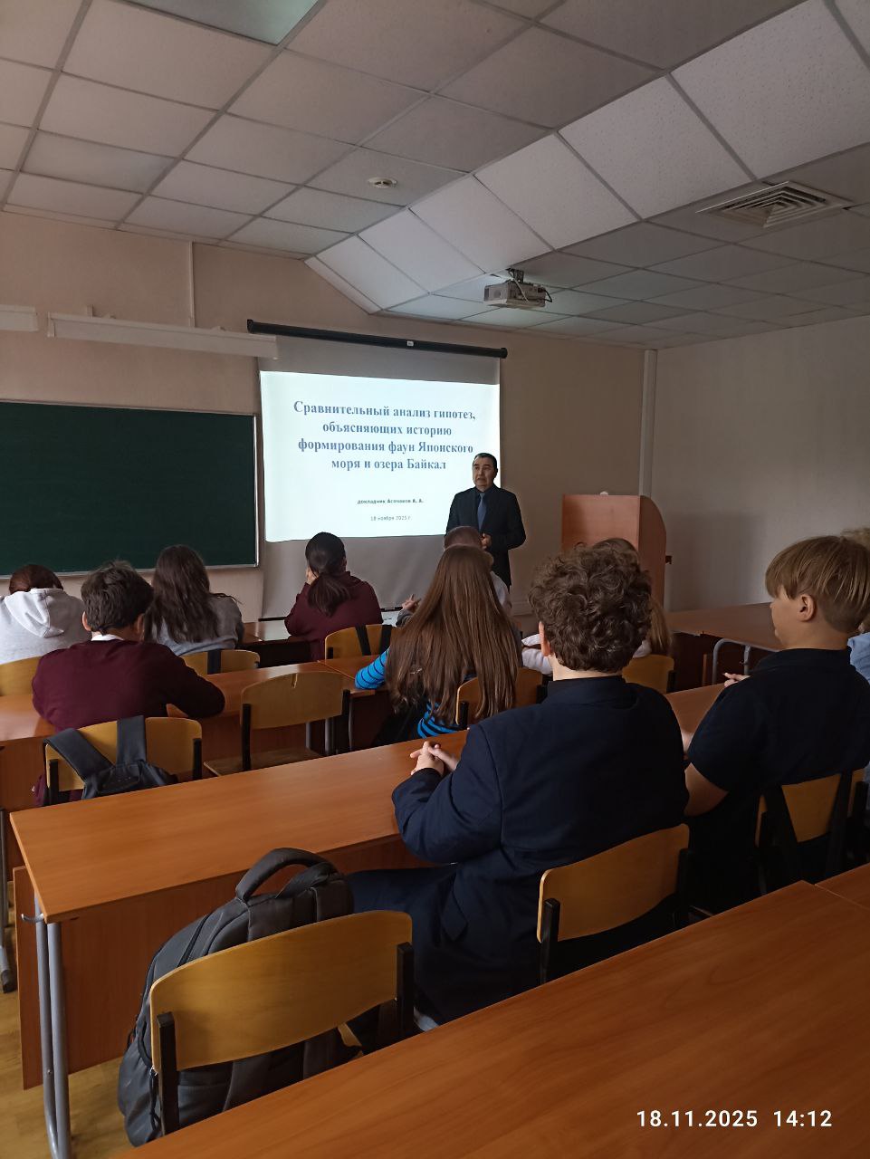 Лектор Анатолий Андреевич Асочаков, кандидат биологических наук, доцент кафедры Биологии Института естественных наук и математики. Темой лекции явился сравнительный анализ гипотез, объясняющих историю формирования фаун Японского моря и озера Байкал.