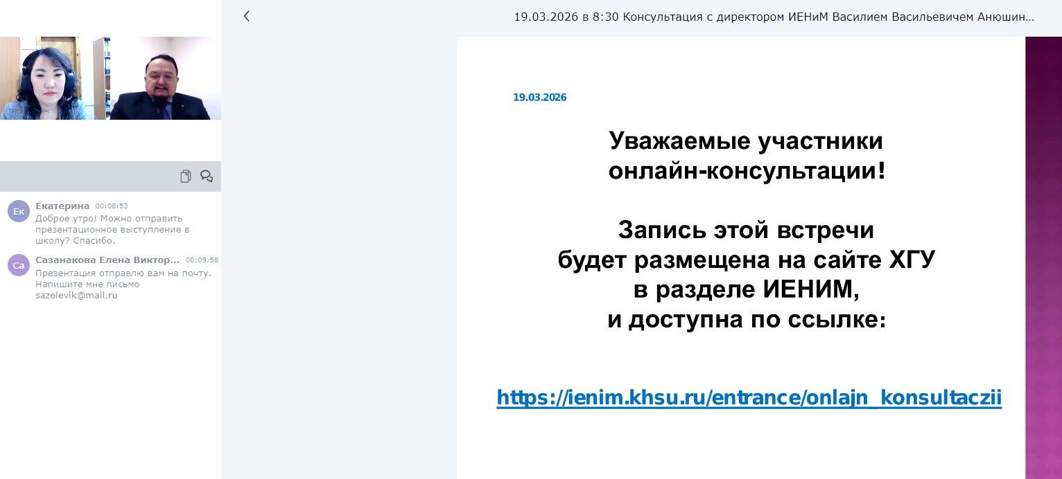 19 марта в 8:30 онлайн для будущих абитуриентов традиционно директор института Василий Васильевич Анюшин провёл открытую онлайн-консультацию по вопросам поступления в Институт естественных наук и математики Хакасского госуниверситета.