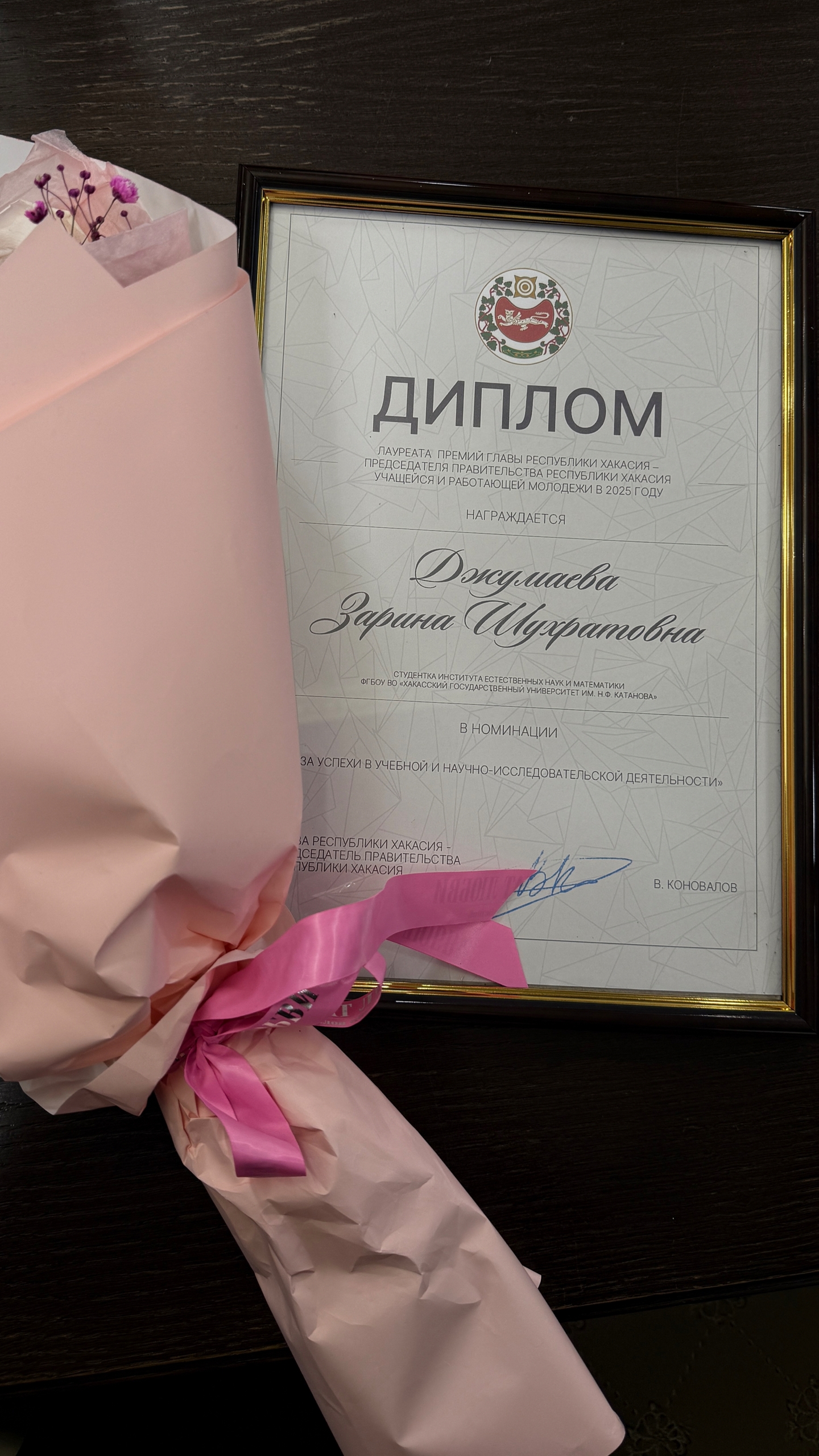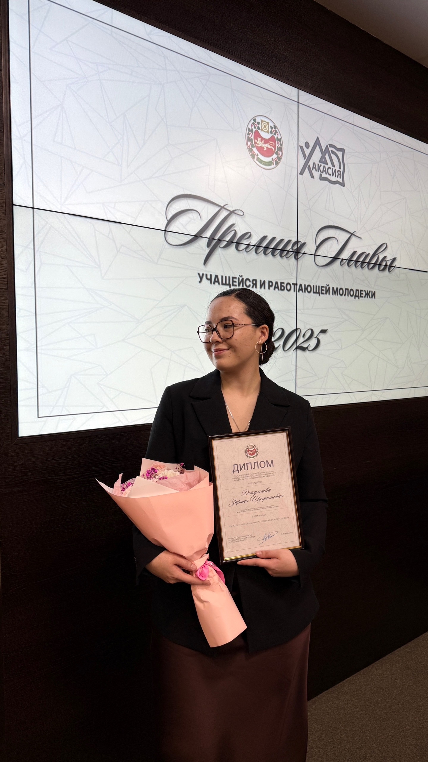 Сегодня в зале заседания Правительства Республики Хакасия по номинации «За успехи в учебной и научно-исследовательской деятельности» наградили студентку 5 курса направления 44.03.05 Педагогическое образование, профили: «Безопасность жизнедеятельности», «Физическая культура» – Зарину Джумаеву! Заринапредседатель Совета СНО ИЕНИМ, председатель научной секции (кружка) «Территория здоровья». Она проявила выдающиеся способности и усердие в учёбе и научной деятельности, что было отмечено на высоком уровне.